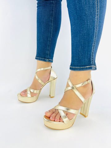 1. Spunkz Metallic Gold Platform Chunky Heeled Ankle Strap Sandals