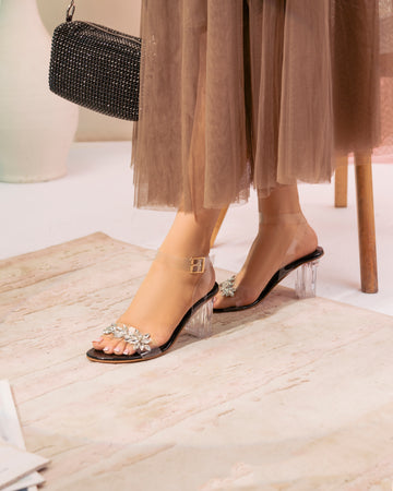 The Spunkz Emily Block Heel Strappy Sandal is the ultimate choice for any special occasion. With transparent rhinestone straps and a crystal-clear block heel, these sandals are elegant yet bold. Perfect for pairing with traditional and contemporary outfits, these block-heel sandals complement any formal attire, whether it’s for a wedding, a party, or a night out.