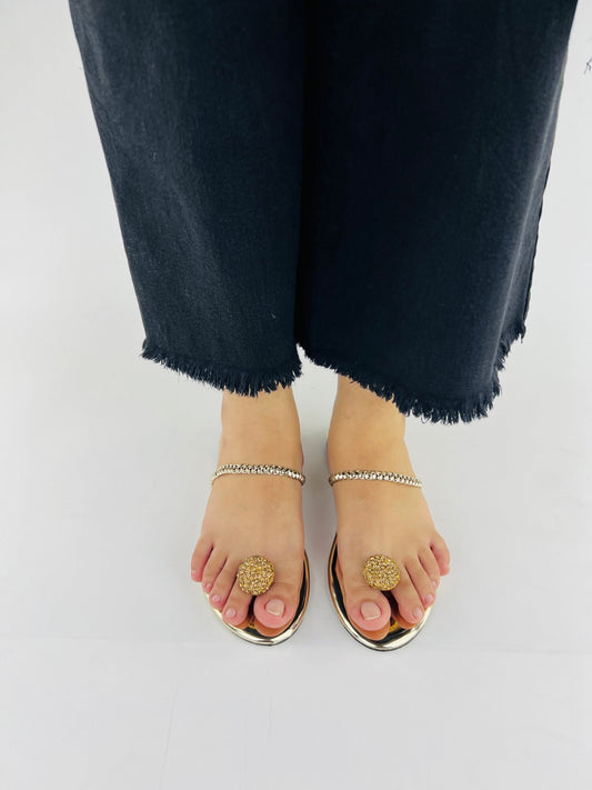 Step into glamour with our Rhinestone Embellished Toe Ring Flats. These flats are adorned with sparkling rhinestones that add a touch of luxury to your footwear collection. The toe ring design ensures a secure fit, while the flat sole provides all-day comfort. These flats are perfect for weddings, parties, or any occasion where you want to shine.