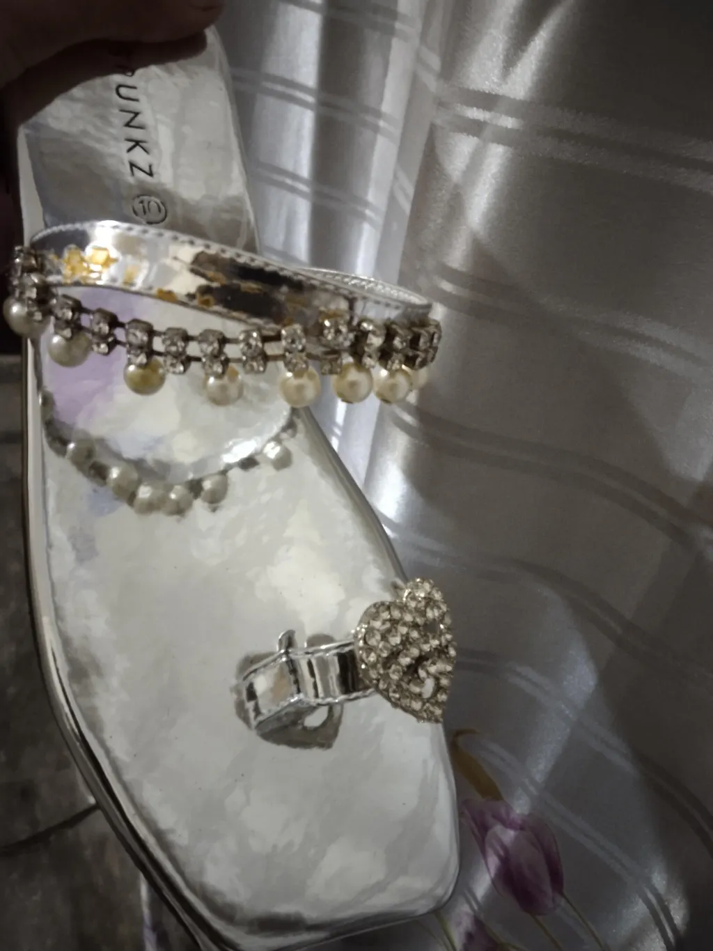 Some of the diamontis were missing. Also although the sole is of size 40 the placement of toe strap makes foot hang a lil bit out from the end. There is ample space at the front side but because of placement of toe strap(heart shaped) shoe gives an image of smaller size. I hope you get what im trying to explain.